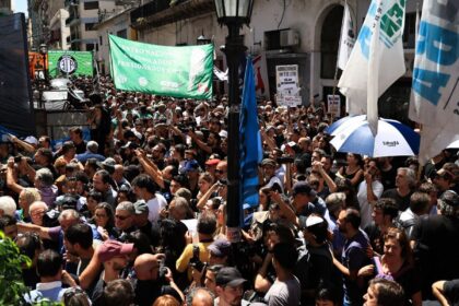 Trabalhadores da agência pública argentina Télam estão acampados em frente ao prédio…