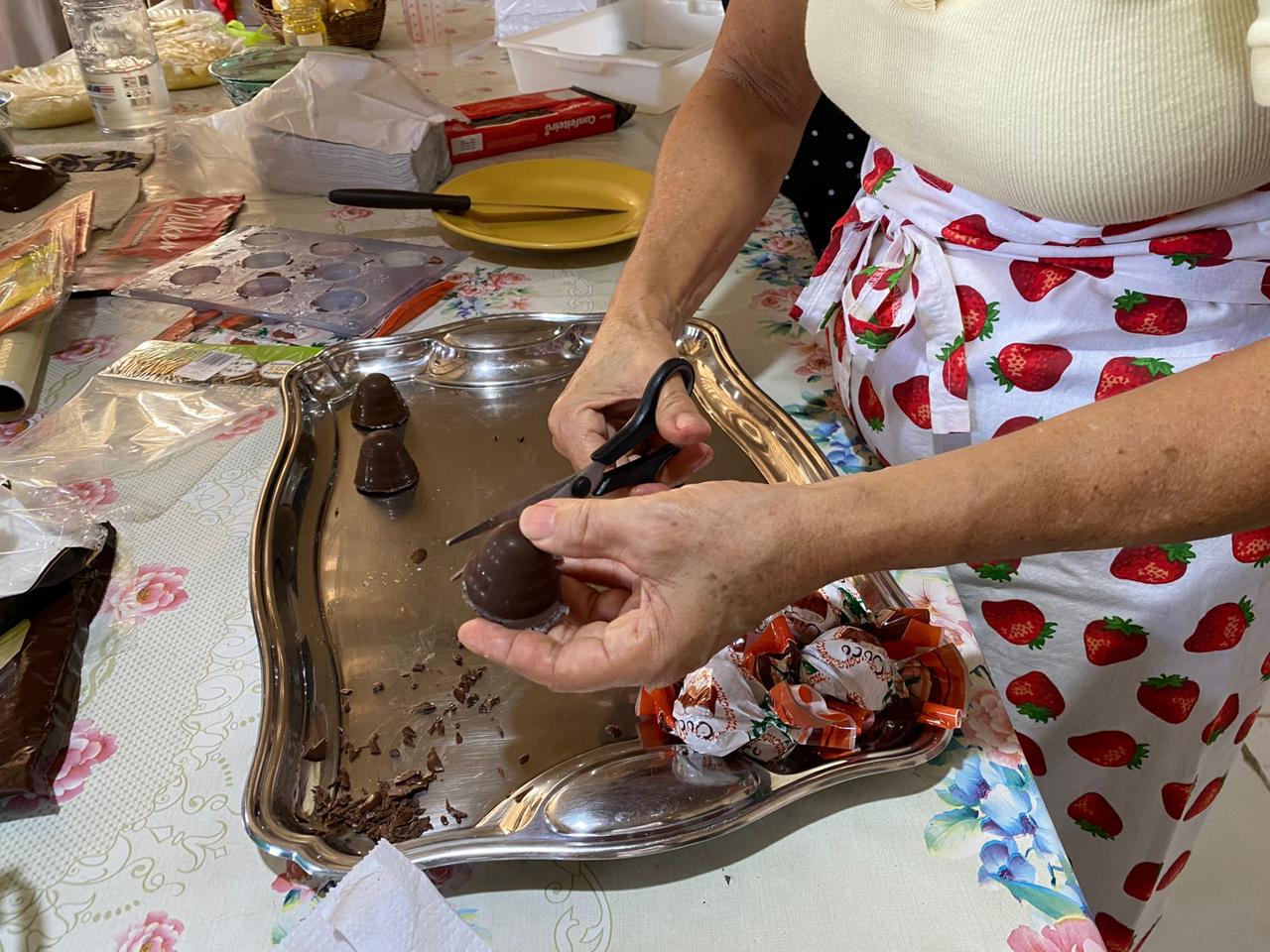 Durante a oficina, as mães aprenderam todas as etapas da produção das trufas, desde a preparação do chocolate até o acabamento. O conteúdo incluiu o processo de temperagem simples, que consiste no derretimento do chocolate em banho-maria ou no micro-ondas, com orientações sobre o ponto ideal e cuidados, garantindo brilho e textura firme às casquinhas, além do preparo de recheios com ingredientes acessíveis e combinações que ampliam a variedade e o potencial de vendas. As participantes também aprenderam técnicas de fechamento, desenformagem, finalização e receberam dicas de conservação, embalagem e apresentação para comercialização.