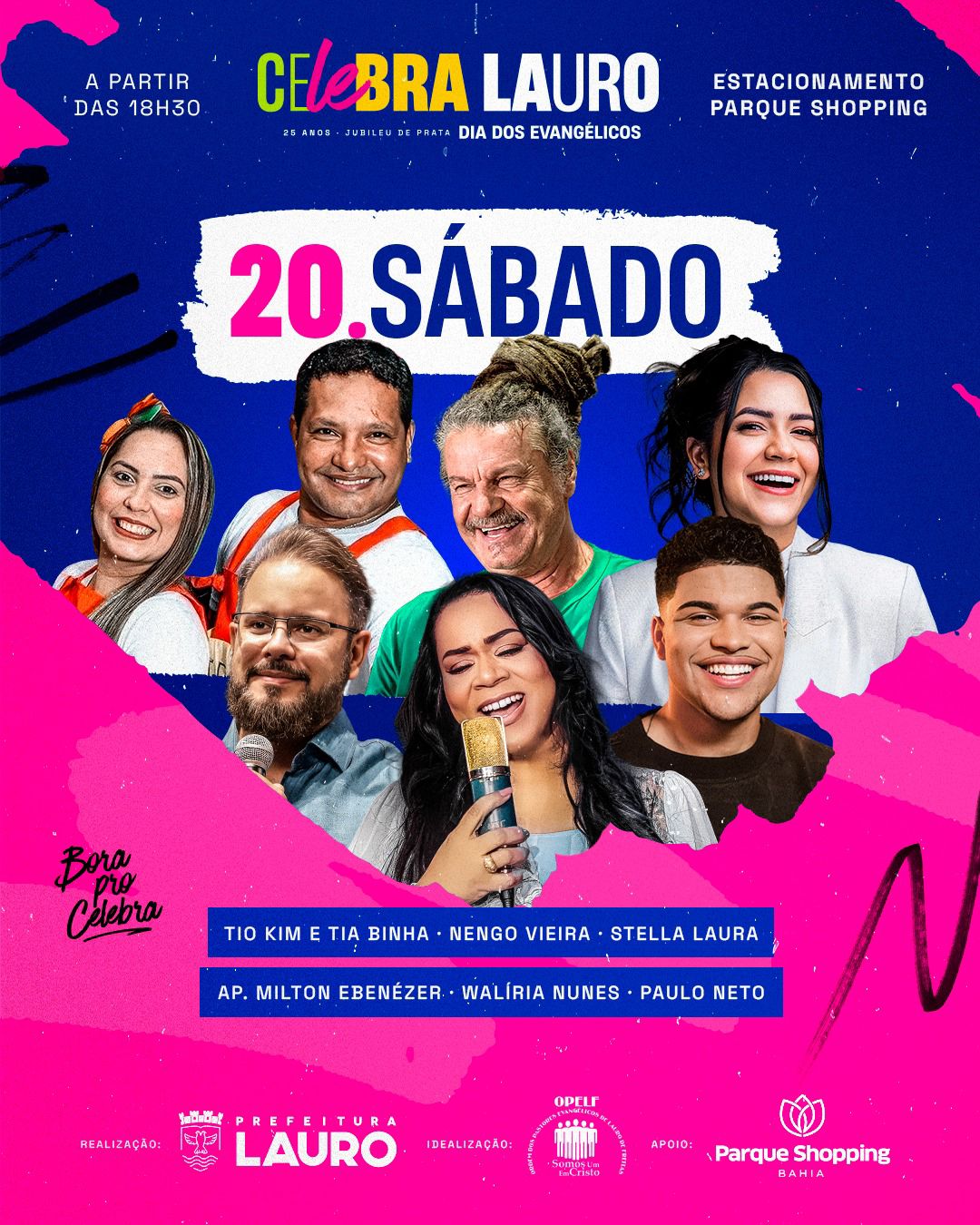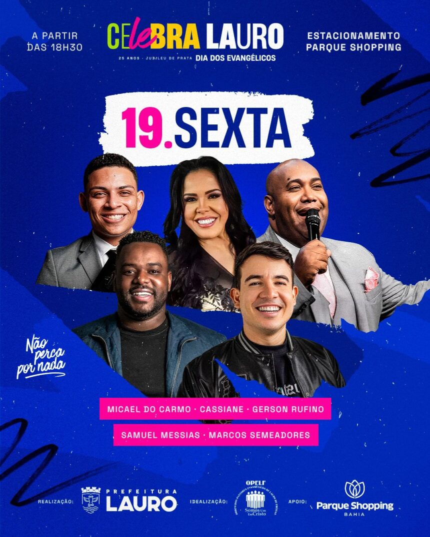 Lauro de Freitas será palco de uma grande celebração da música gospel com a realização da primeira edição do Celebra Lauro, evento que reúne artistas consagrados do cenário nacional e talentos locais nos dias 19 e 20 de dezembro, sexta-feira e sábado, a partir das 18h, na área do estacionamento do Parque Shopping Bahia. Embora o evento seja gratuito, o público pode contribuir levando 1 kg de alimento não perecível, fortalecendo a solidariedade e fazendo a diferença em um encontro que promete dois dias de fé, louvor e emoção.