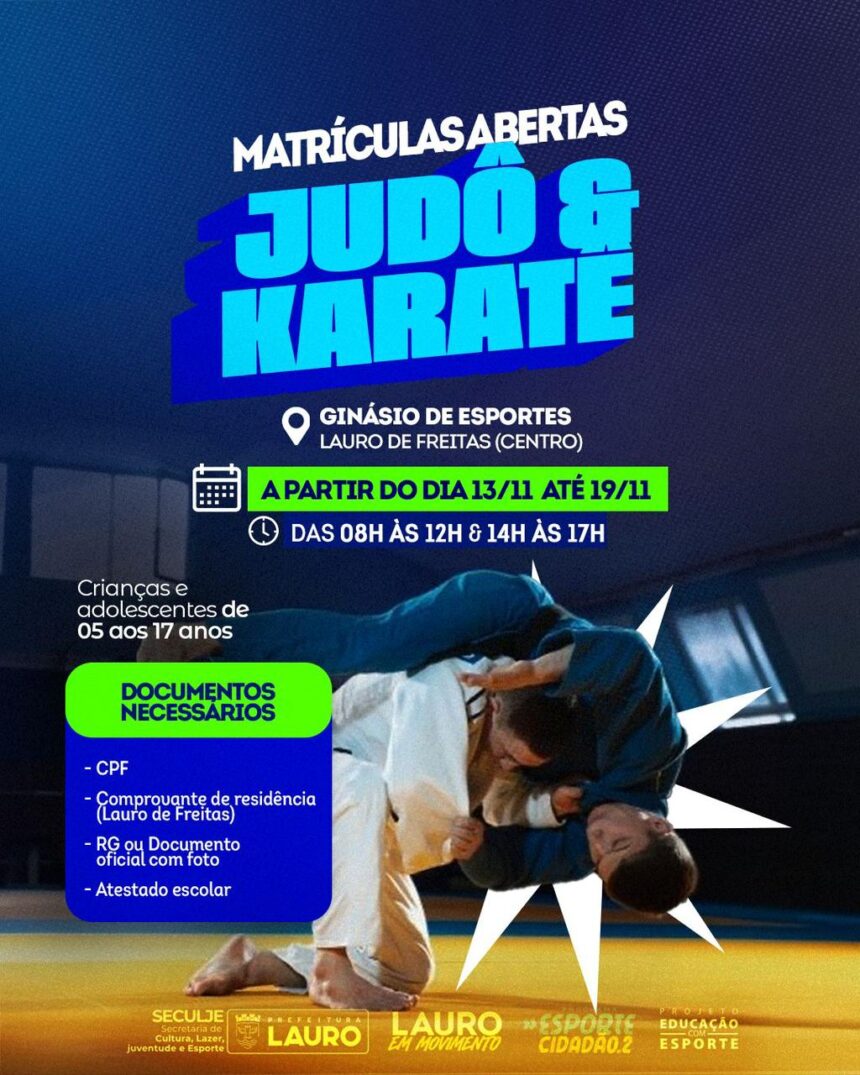 Consolidando-se como a cidade do esporte, a Prefeitura de Lauro de Freitas, por meio da Secretaria Municipal de Cultura, Lazer, Juventude e Esporte (SECULJE), abre nesta quinta-feira (13/11) as inscrições para aulas gratuitas de Judô e Karatê voltadas a crianças e adolescentes de 5 a 17 anos.