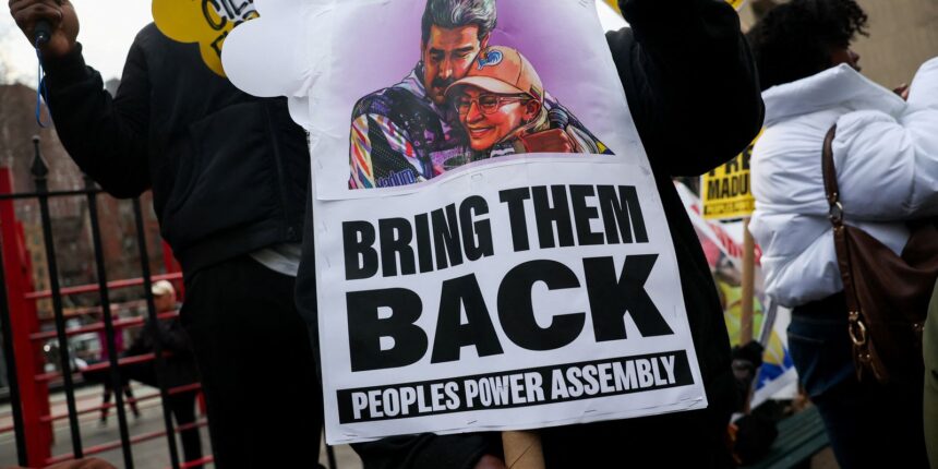 Ele e a esposa seguem presos em Nova York, quando foram presos durante uma operação das forças militares dos EUA na Venezuela em janeiro. Do lado de fora, manifestantes pediam a libertação de Maduro.