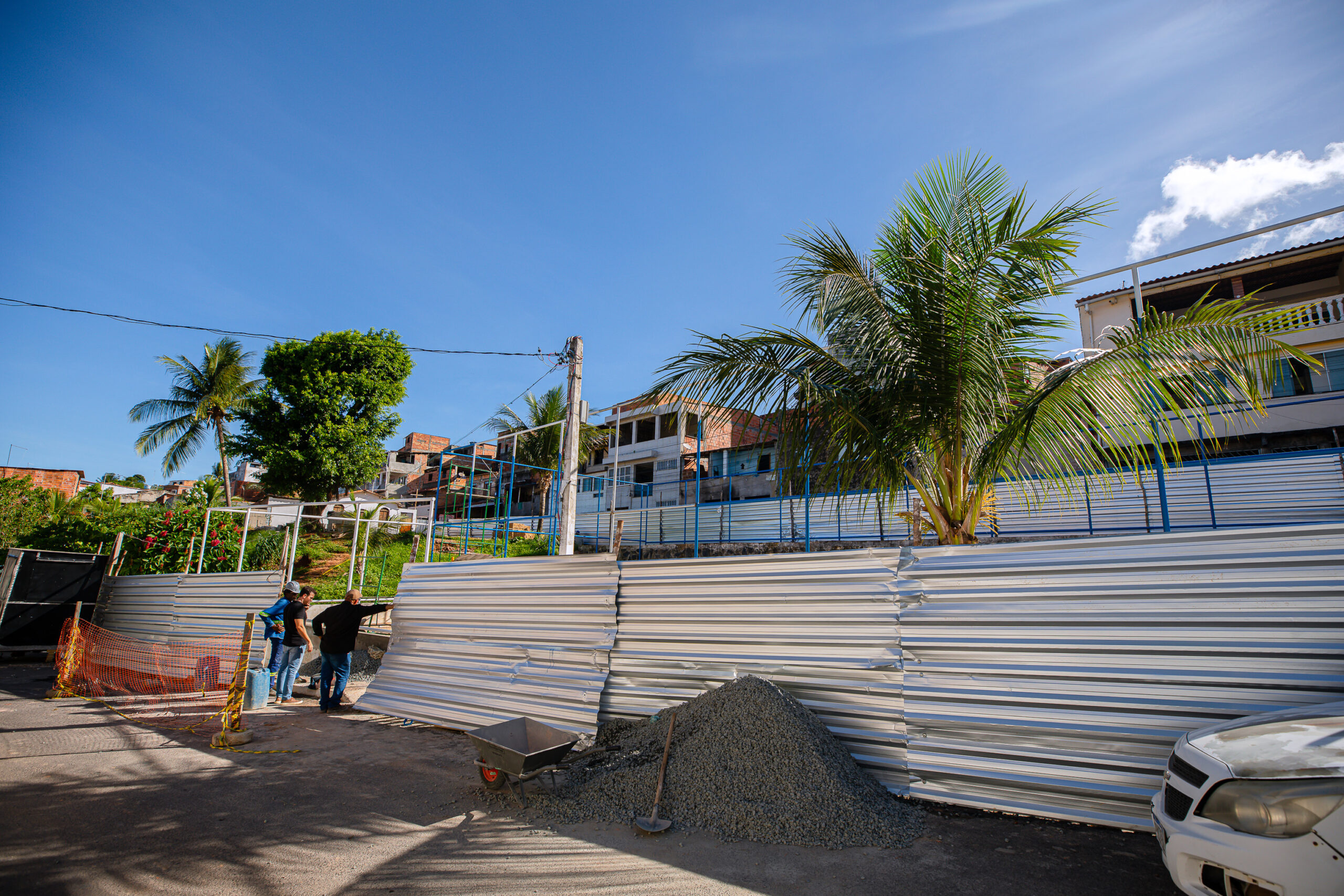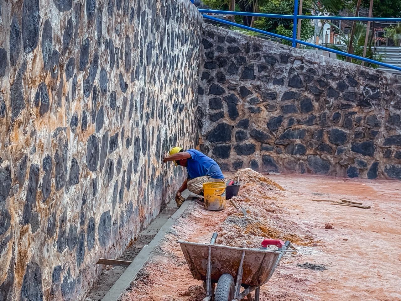 Já na área da praça, os trabalhos avançam com serviços de demolição das estruturas antigas e instalação de meio-fio, etapas iniciais que preparam o espaço para a nova configuração do equipamento público.