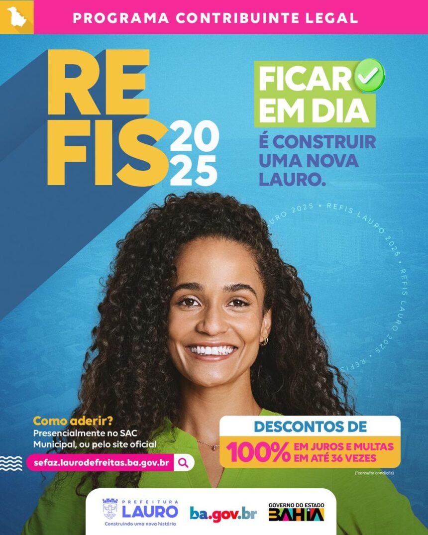 A Prefeitura de Lauro de Freitas, por meio da Secretaria Municipal da Fazenda (SEFAZ), lançou o Programa Contribuinte Legal com Lauro de Freitas 2025, uma ação de Recuperação Fiscal (REFIS), voltada à renegociação de dívidas que acontece até a última sexta-feira do mês (28/11), com descontos e facilidades no pagamento à vista ou parcelado.